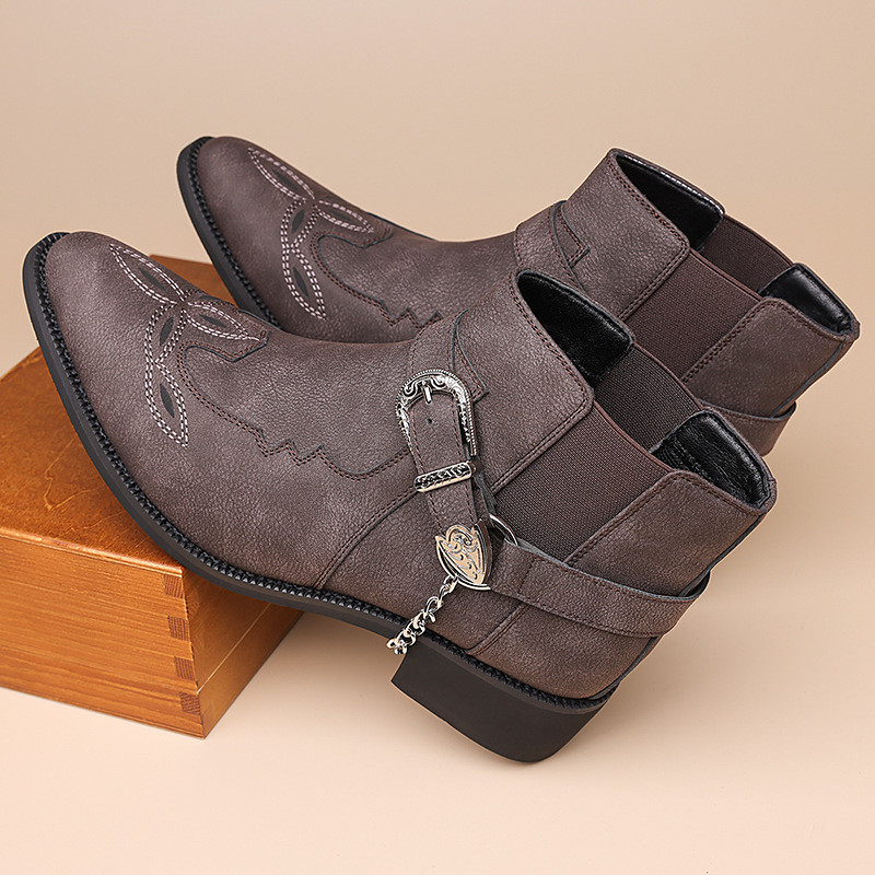 Men's Gray Faux Leather Western Ankle Boots – Buckled Strap and Metal Chain Design for Country Concerts, Nightlife Parties and Statement Streetwear