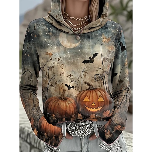 Frauen T-Shirt Monster Lange Ärmel Grafik Kürbis Buchstabe Vintage Stilvoll Lange Ärmel Rundhals Lange Tops Alltags-Ausgehen Wochenend Tasche Druck Dunkelgrau Frühling Herbst Vorherherbst
