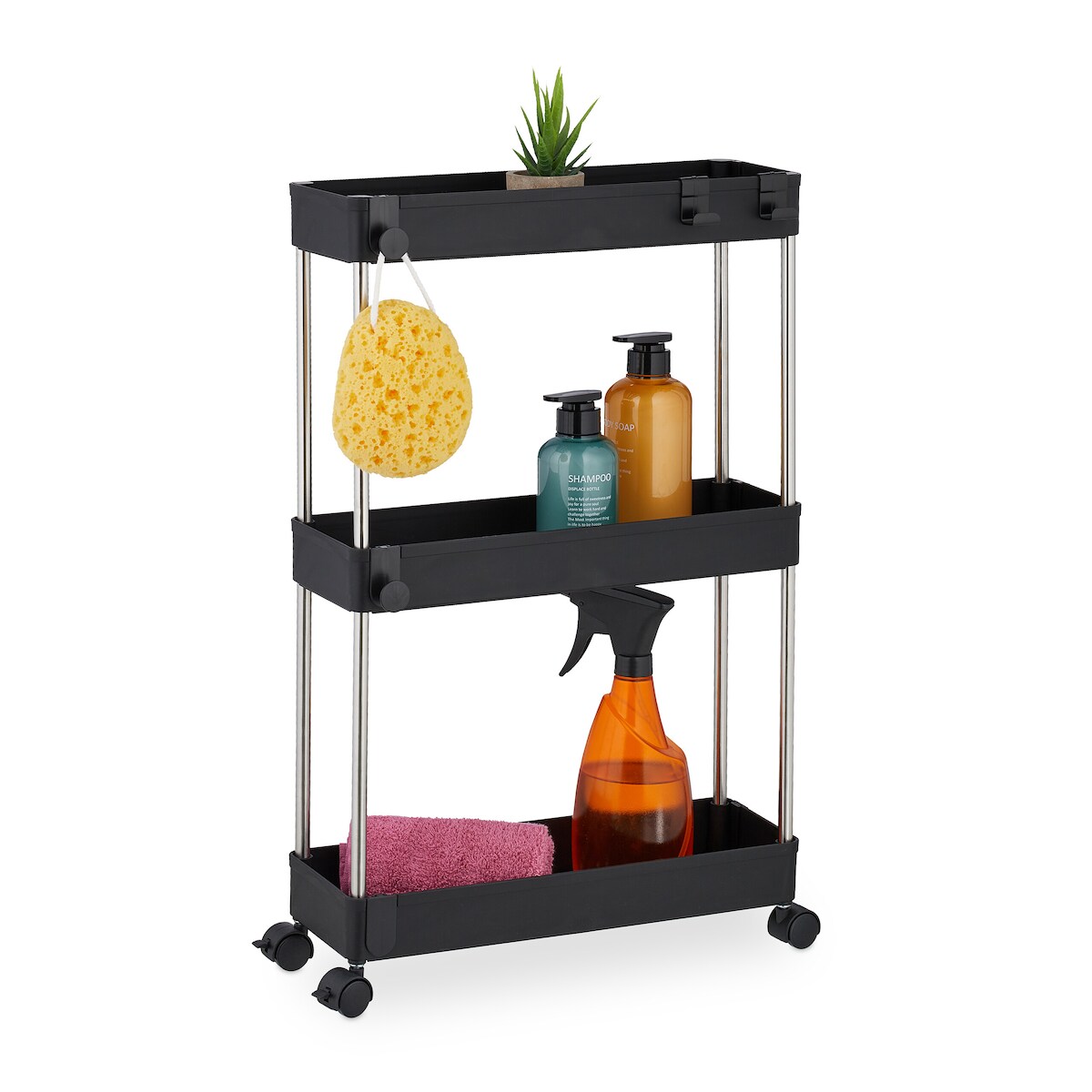 Relaxdays Nischenwagen, 3 Etagen, schmales Nischenregal für Küche & Bad, HxBxT: 62 x 41,5 x 14,5 cm, Rollregal, schwarz