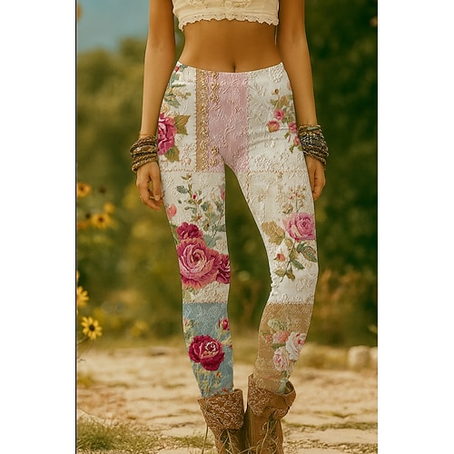 Per donna Leggings Vacanza Vintage Stile Etnico Lunghezza intera Vita Alta Floreale Grafico Stampa 3D Asciugatura Rapida Traspirabilità Morbido Elasticizzato Quotidiano Casa All'aperto Bianco Rosa