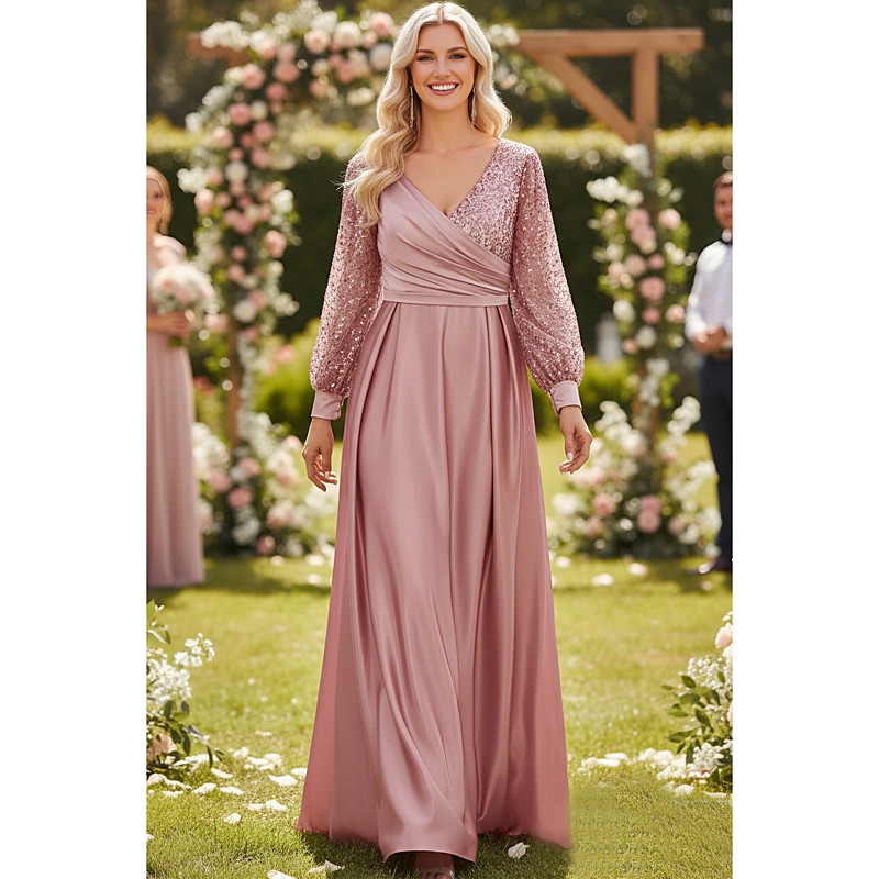 A-Line Floor Length Prom Dress Wedding Guest Dress Formal Dresses Mother of the Bride Dress Long Sleeve V Neck Elegant Party Sparkle Shine Wedding Guest Holiday Cocktail Party Satin Glitter with