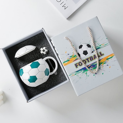 Set regalo di tazze in ceramica a forma di pallone da calcio, tazza da 12 oz/350 ml con tema calcistico, coperchio e cucchiaio, tazza da caffè ricordo sportivo con confezione regalo, bicchieri