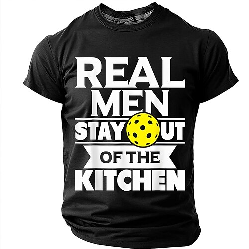 I veri uomini stanno fuori dalla cucina. Maglietta sportiva da uomo gialla con grafica divertente a tema pickleball, maniche corte, girocollo, casual, abbigliamento firmato, taglie S, M, L, XL, XXL,