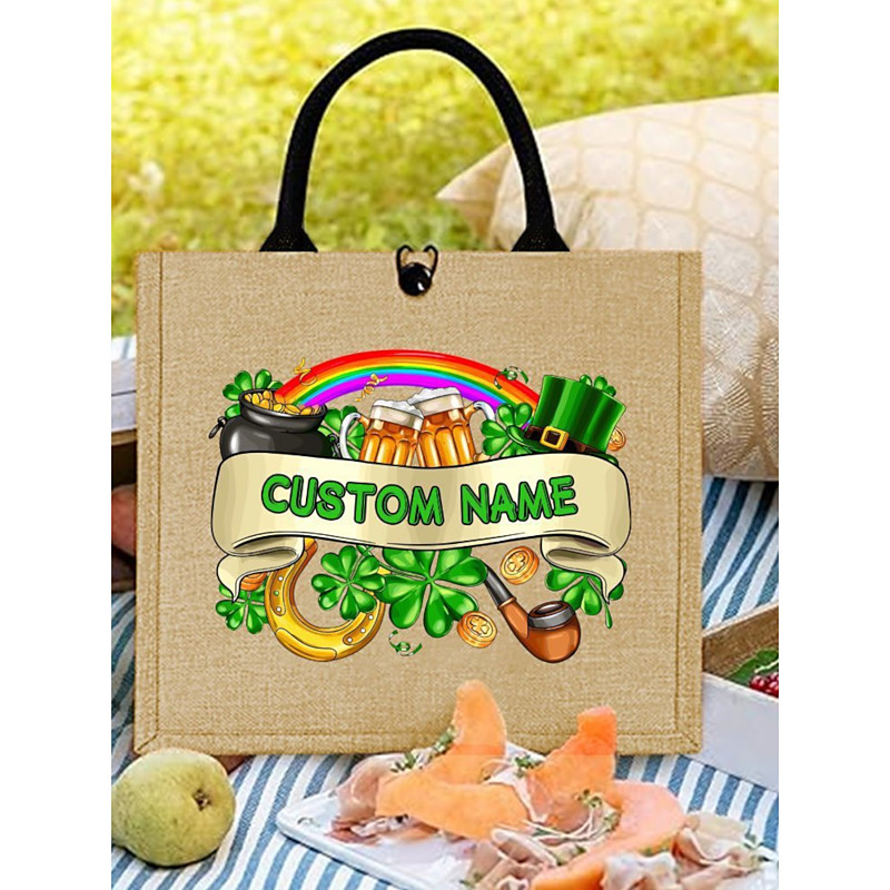 Women's Customizable St. Patrick's Day Tote Bag – Festive Eco-Friendly Burlap Bag with Clover, Rainbow, and Lucky Charms, Perfect for Holiday Celebrations