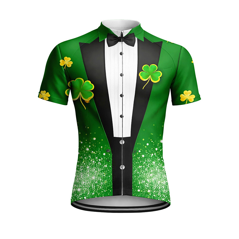 Men St Patrick Jersey Cycling Jersey Downhill Jersey Four Leaf Clover Suit T-Shirt Tuxedo Short Sleeve Bike Jersey T Shirt Top with 3 Rear Pockets UV Resistant Fast Dry With Pockets Front Zipper