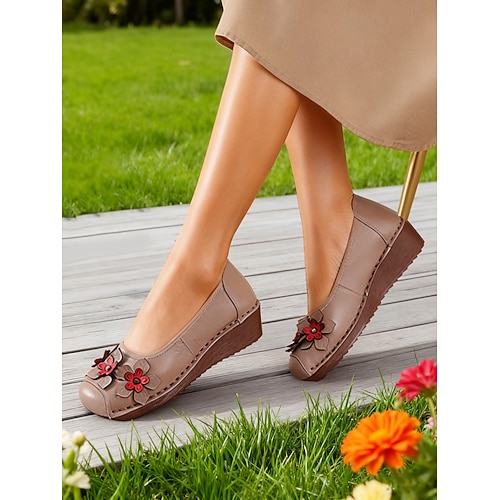 scarpe basse da donna in vera pelle rossa con fiori – comode scarpe slip-on con zeppa e fiori retrò 3D fatti a mano per lavoro e abbigliamento casual
