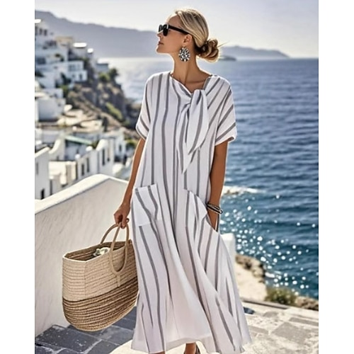 Per donna Abito Midi Vestito Casual Abito a trapezio Elegante Casual Quotidiano Vacanza Vestibilità comoda A righe Manica Corta Girocollo Grigio Azzurro Estate Primavera