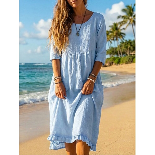 Per donna Abito Midi Finto cotone e lino Abito da Spiaggia Vestito Casual Vestito Estivo Vacanza Essenziale Ferie Weekend Vestibilità comoda Semplice Manica 3/4 Girocollo Blu Nero Verde Albicocca