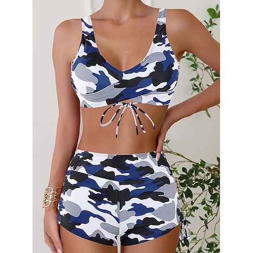 Costume da bagno bikini da donna a 2 pezzi con pantaloni leopardati schiena scoperta per vacanze in spiaggia camo scollatura a V senza maniche