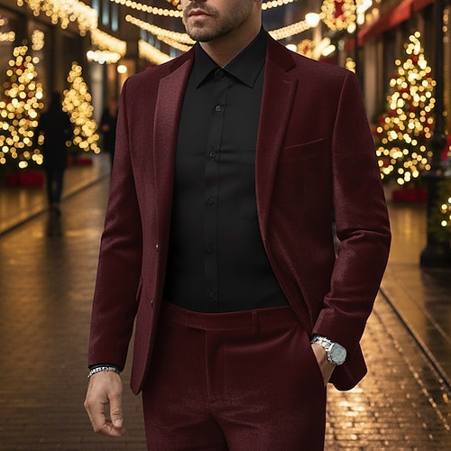 Abiti casual da uomo per feste di Natale in velluto con revers a lancia, giallo e rosso, tinta unita, vestibilità slim, 2 pezzi, monopetto, due bottoni