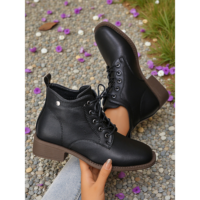 Women's Black Faux Leather Combat Boots, Classic Lace-Up Chunky Sole Ankle Booties, Perfect for Fall Outfits, Outdoor Walks Streetwear Looks