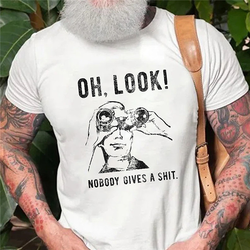 Men's Funny Sarcastic Short Sleeve Graphic T-Shirt with 'Oh Look Nobody Gives a Shit' Binoculars Print