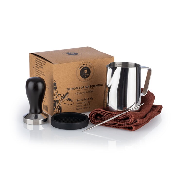 Buddy's Bar 5-teiliges Barista Set Milchkännchen 0,35l Tamper Ø 51mm Latte Pen: 13,5 cm Baristatuch PAN