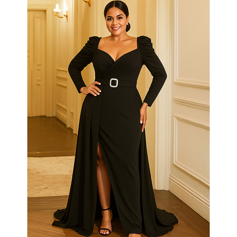 A-Line Floor Length Wedding Guest Dress Formal Dresses Evening Gown Mother of the Bride Dress Long Sleeve V Neck Elegant Vintage Party Spandex with Pleats Split Front