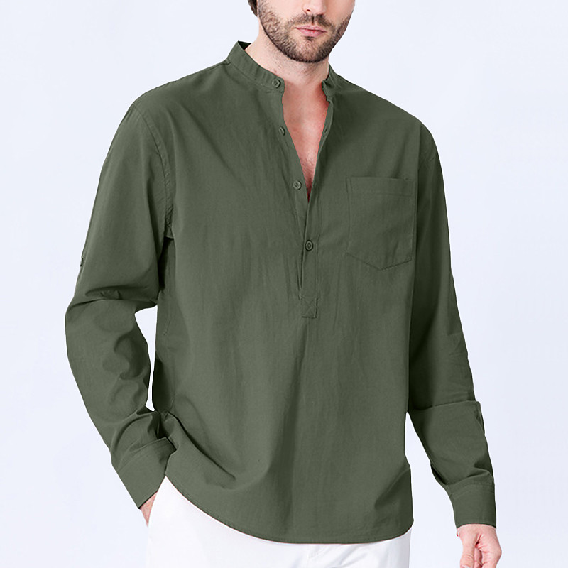 Men's Shirt Band Collar Shirt Popover Shirt Casual Shirt Black Red Green khaki Light Grey Long Sleeve Solid Color Henley Party Going out Front Pocket Clothing Apparel Fashion Sports Outdoors