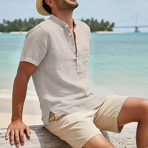 Herren Leinenhemd Sommerhemd Strandbekleidung Freizeithemd Stehkragenhemd Einfarbig Lässig Täglich Schwarz Weiß Hellgrün Blau Kurzarm Henley Sommer Frühling Bekleidung Button-Down