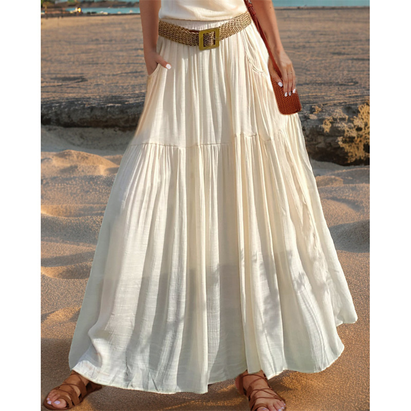 Women's Asian Size Swing Linen Skirts Casual Summer Midi High Waist Skirts Solid Colored Ruched Pleated Pocket Stretchy Vacation Daily Wine Watermelon Red Mustard green Orange color Spring, Fall