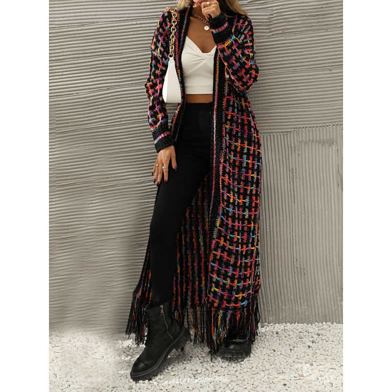 Women's Sweater Cardigan Elegant Fashion Streetwear Plaid Ribbed Open Front Tassel Knitted Long Sleeve Long Tops Knit Outdoor Daily Weekend Black Yellow Spring Fall