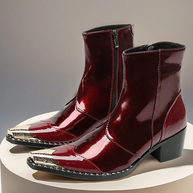 Men's Shiny Red Leather Ankle Boots – Chic Glossy Finish with Comfortable Block Heel, Stylish Choice for Christmas Events