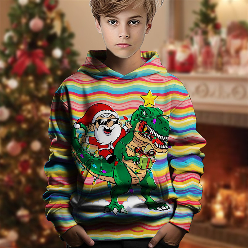 Boys' 3D Graphic Santa Claus Dinosaur Hoodie Long Sleeve Spring Fall Fashion Streetwear Kids 4-12 Years Hooded Outdoor Casual Daily Regular Fit