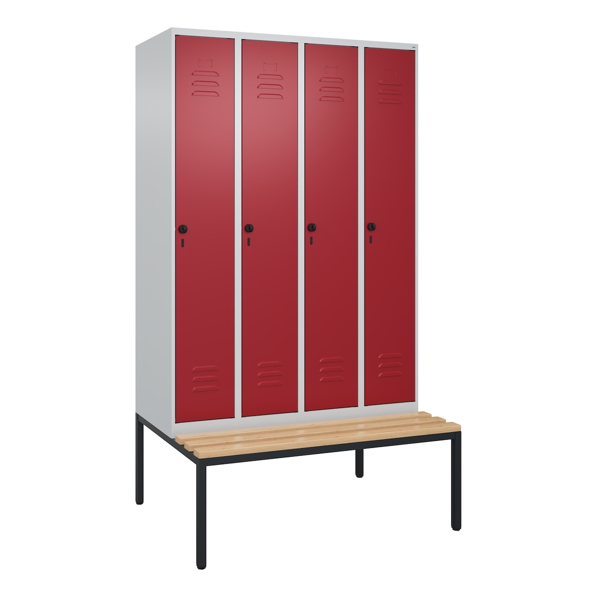 C+P Spind Classic PLUS, Buche untergebaute Sitzbank 4 Abteile, HxBxT 212x120x82cm, Sicherheitsdrehriegel, Hellgrau/Rubinrot von PROREGAL