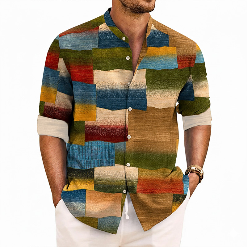 Men's Geometric Color Block Patchwork Shirt Stand Collar Shirt Long Sleeve Fashion Casual Dailywear Holiday Spring Fall Mandarin Collar Band Collar 3D Print Button Up Shirts Army Green Purple Khaki