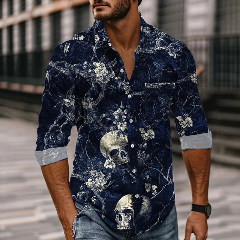 Men's Skull Day of the Dead Rose Shirt Button Up Shirt Long Sleeve Dark Gothic Style Holiday Spring Fall Turndown 3D Print Collared Shirts Front One Pocket Red Dark Blue