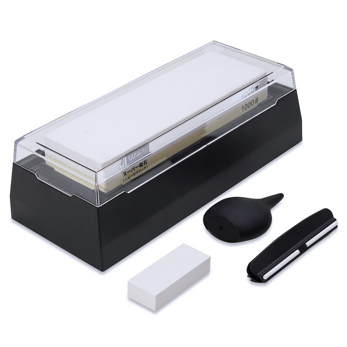 Wakoli Schleifstein Körnung #1000/4000 mit Schleifhilfe, Begradigungsstein, Wasserspender und Kunststoffbox