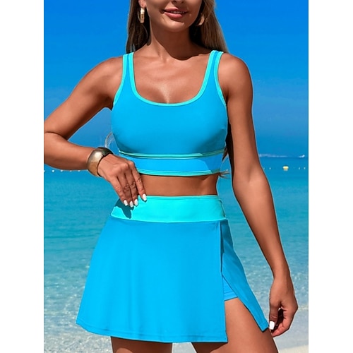 Costume da bagno a tankini da donna a 2 pezzi pantaloni color block controllo della pancia vita alta slim senza schienale abbigliamento da spiaggia per vacanze floreale scollatura a U senza maniche