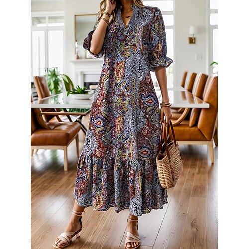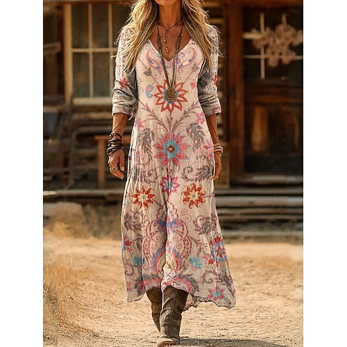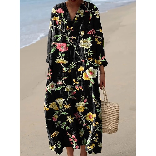 Per donna Abito maxi Vestito Estivo Abito a trapezio Vacanza Casual Boho Spiaggia Feste Vestibilità comoda Floreale Grafico Manica Lunga Scollo a V Marrone scuro Nero Beige Estate Primavera