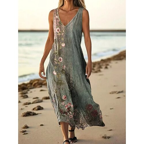 Per donna Abito Lungo Maxi Abito Abito Boho Abito Vintage Vestito Casual Vintage Ferie Vestibilità comoda Floreale Senza Maniche Scollo a V Blu Rosso Beige Estate Primavera