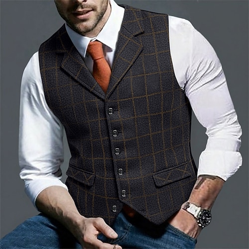Per uomo Gilet in tweed Gilet Formale Matrimonio Vacanza Quotidiano Moda Classico Primavera Autunno Tasca Bottoni Poliestere Tweed Confortevole Plaid Semplice Monopetto Scollo a V Vestibilità aderente
