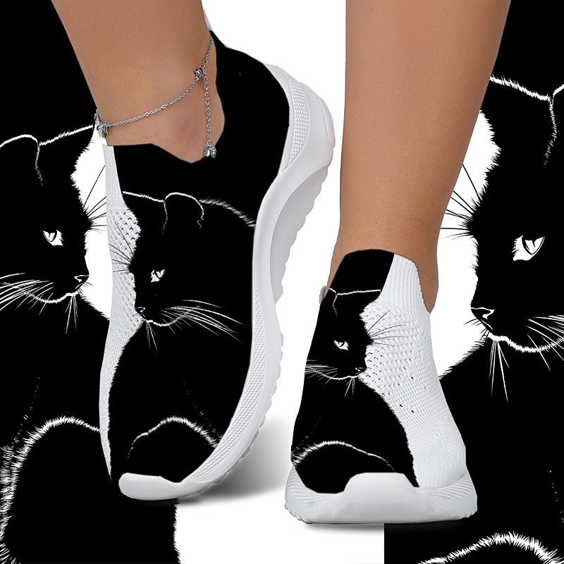Women's Black Cat Print Slip-On Sneakers – Breathable Knit Walking Shoes for Casual Wear, Travel, and Cat Lovers