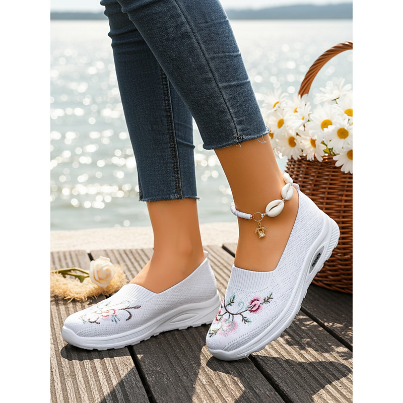 Women's Green Slip-On Sneakers with Floral Embroidery – Breathable Knit Walking Shoes for Outdoor Sports, Travel Nursing