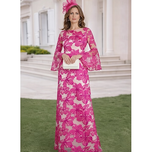 Linea ad A Lunghezza al pavimento Abito da invitata a nozze Largo Abito da cerimonia per signora Manica 3/4 Scollo Illusione Scollo a Barca Elegante Vintage Formale Ospite di nozze Serata Formale