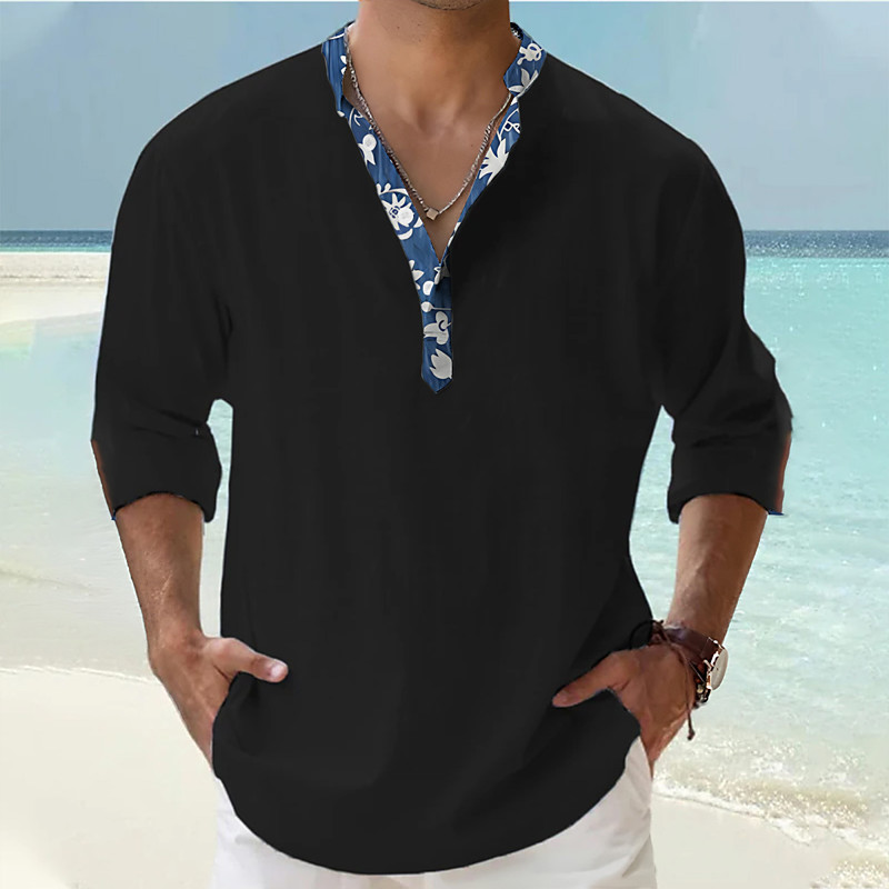 Men's Shirt Popover Shirt Summer Shirt Casual Shirt Beach Shirt Black White Pink Orange Green Long Sleeve Floral Print Solid / Plain Color Band Collar Henley Vacation Hawaiian Buckle Clothing Apparel