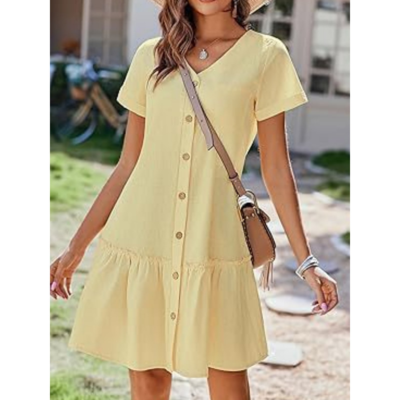 Women's Mini Dress Cotton Linen Dresses Stylish Basic Casual Daily Regular Fit Plain Short Sleeve V Neck White Yellow Summer