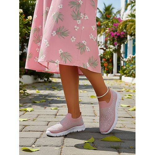 scarpe da ginnastica slip-on da donna con strass rosa - tomaia in Flyknit traspirante, leggere scarpe sportive casual scintillanti per camminare, fare jogging, viaggiare, indossare ogni giorno