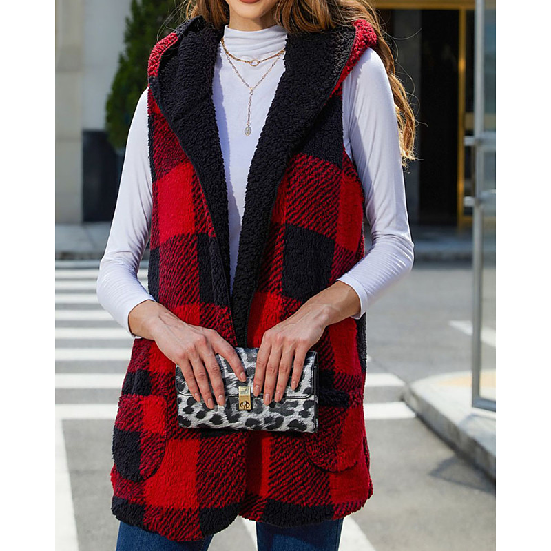 Women's Winter Coat Fleece Vest Vest Warm Comfortable Patchwork Pocket Fashion Casual Plaid Vacation Street Casual Daily Wear Regular Hooded Regular Fit Sleeveless Outerwear Red Fall Winter