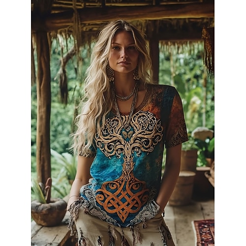 Women's Viking T Shirt Graphic Geometric Tribal Bohemia Vintage Stylish Short Sleeve V Neck Regular Tops Daily Going out Weekend Print Purple Summer Spring Fall