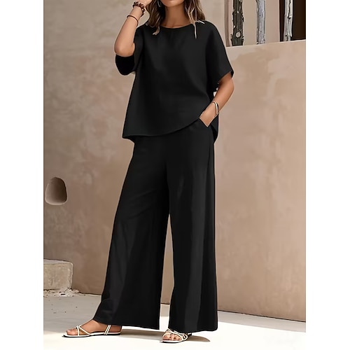 Per donna Set di Pantaloni Finto cotone e lino Manica Corta Girocollo Tinta unica Moda Streetwear Casuale Quotidiano All'aperto Blu Nero Giallo Estate Vestibilità comoda