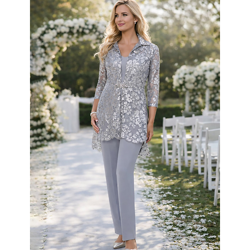 Jumpsuit Pantsuit 3 Piece Ankle Length Mother of the Bride Dress 3/4 Length Sleeve V Neck Elegant Plus Size Formal Wedding Guest Chiffon Lace Wrap Included with Sequin Crystal Brooch