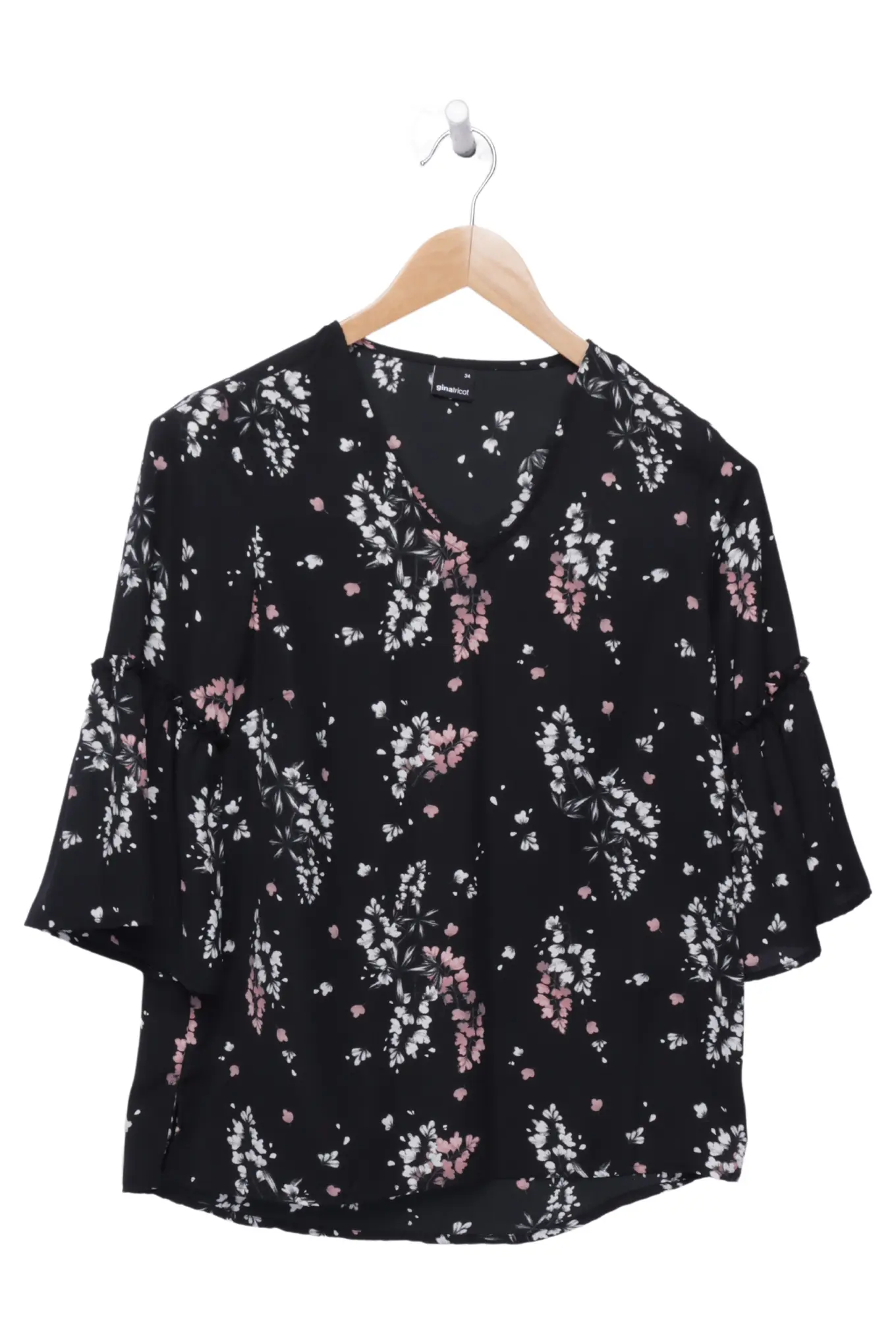 GINA TRICOT Bluse Schwarz Floral Gr. 34 Rüschenärmel Damen