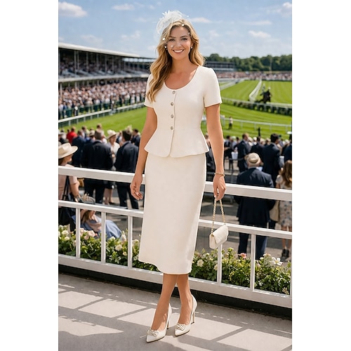 Abito a due pezzi tubino lunghezza tè abito da festa abito da cocktail abito da invitata al matrimonio abito per la madre della sposa manica corta collo a giro elegante vintage festa con bottoni