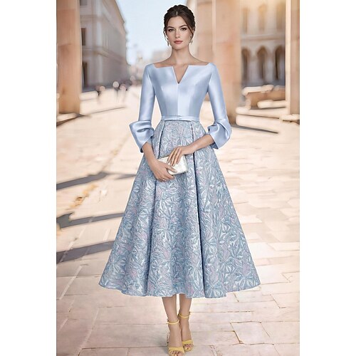Linea ad A Lunghezza Tè Abiti da Cocktail Abiti da festa Elegante Madre Manica 3/4 Scollo a V Formale Ospite di nozze Raso con Pieghe