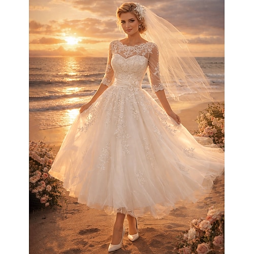 Linea ad A Lunghezza Tè Abiti da sposa Abito da sposa Vintage Anni 1940 / 1950 Piccoli Abiti Bianchi Manica 3/4 Scollo Illusione Laurea Compleanno Pizzo Tulle con Applicazioni