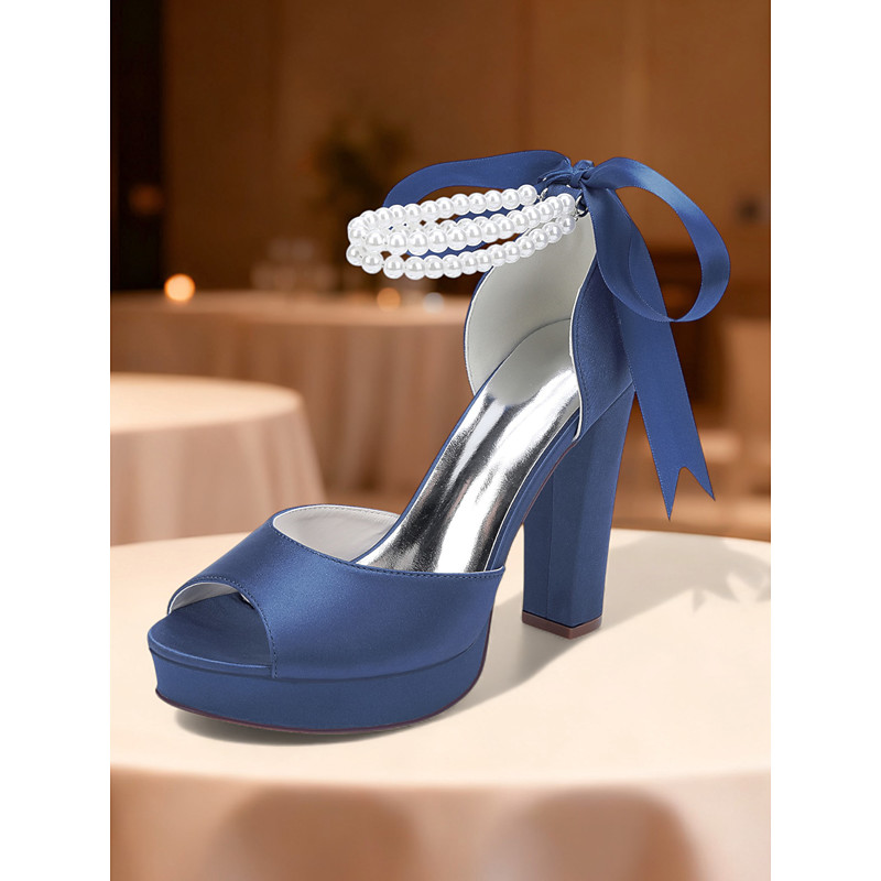 Women's Navy Satin High Heel Sandals – Pearl Ankle Strap Stiletto Heels with Ribbon Bow for Weddings and Elegant Cocktail Party and Special Occasions