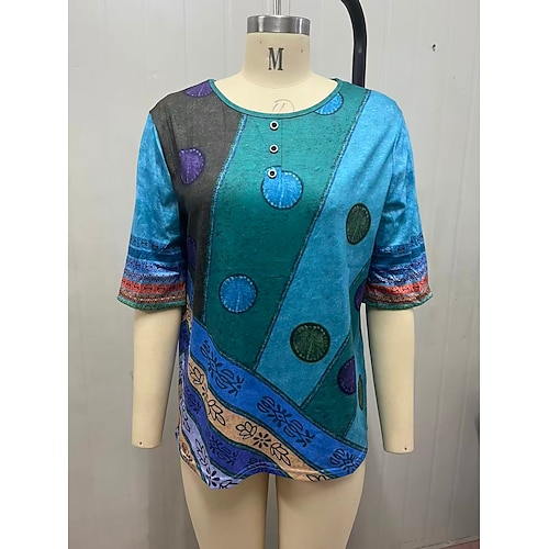 camicia in lino taglie forti da donna, maglietta boho, maglietta streetwear casual, blocchi di colore, stampa a righe, mezza manica, top normali, girocollo, quotidiano, sportivo, fine settimana,