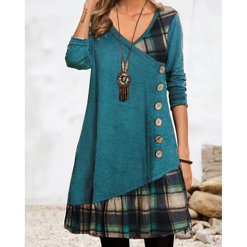 Women's Casual Dress T Shirt Dress Tee Dress Tartan Dress Mini Dress Dark Green 3/4 Length Sleeve Plaid Ruched Winter Fall Spring V Neck Modern Weekend 2023 S M L XL 2XL 3XL