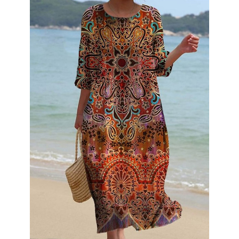 Women's Midi Dress Casual Dress Print Dress Vintage African Daily Beach Weekend Regular Fit Floral Graphic 3/4 Length Sleeve Crew Neck Red Fuchsia Brown Spring Fall Autumn